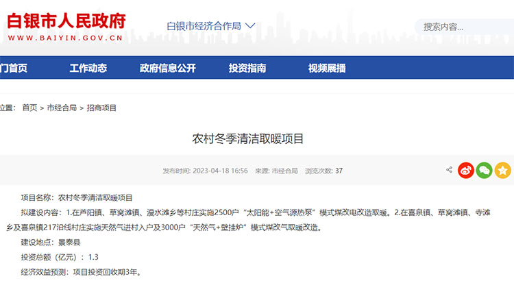 據悉,今年上半年白銀市下屬景泰縣發布了一項總投資額達1.3億元的農村冬季取暖項目,項目涵蓋蘆陽鎮、草窩灘鎮、漫水灘鄉等村莊實施2500戶“太陽能+空氣源熱泵”模式煤改電改造取暖及喜泉鎮、草窩灘鎮、寺灘鄉及喜泉鎮217沿線村莊實施天然氣進村入戶及3000戶“天然氣+壁掛爐”模式煤改氣取暖改造。